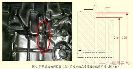 经过长期测量模具型芯和各滑块温度,我们发现模具下滑块整体温度偏高,喷涂后达到290℃以上,对应的产品表面(进气面)也存在严重粘模,将该处的模具冷却水开到最大也无任何改观,说明模具该处冷却结构存在问题,为了找出最根本原因,我们详细查看了该滑块的冷却水布置图及详细尺寸,发现了其中存在的问题:首先冷却回路位置的限制,局部地方冷却效果较差;其次,由于布置的点冷处壁厚较大,造成点冷效果较差;针对这两个问题,我们对局部冷却效果较差部位增加了点冷,并将原来点冷处效果较差处,加深了点冷通道的深度(如图七所示),加强了对下滑块高温处的冷却。调整了模具冷却通道后,我们反复调试喷涂位置和喷涂时间,在保证产品质量的情况下,成功将喷涂时间缩短了6秒,使整个压铸单元的生产节拍最终降低到177秒,生产效率提升18%以上。